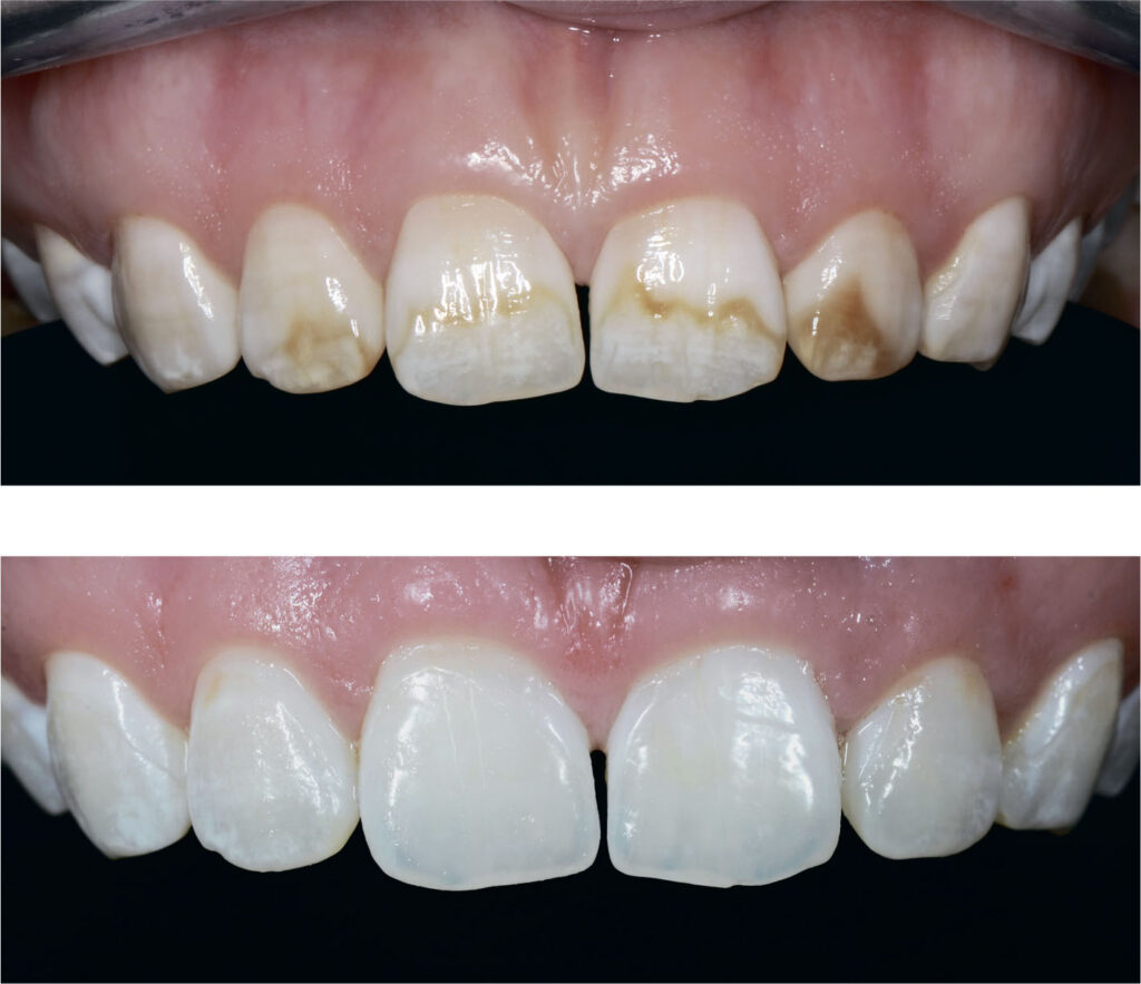 Методы реминерализующей терапии остаются важной частью комплексного подхода, однако только ремтерапия не способна устранить эстетические проявления флюороза. Она работает на укрепление структуры эмали, улучшение микрофлоры, повышение устойчивости к кариесу, но не может устранить пигментацию или визуальные дефекты. На протяжении многих лет эстетические жалобы пациентов с флюорозом решались радикально: с помощью виниров или коронок. Это означало обязательную обточку зубов — иногда вполне здоровых — и дальнейшую реставрацию. Это дорогостоящая процедура.