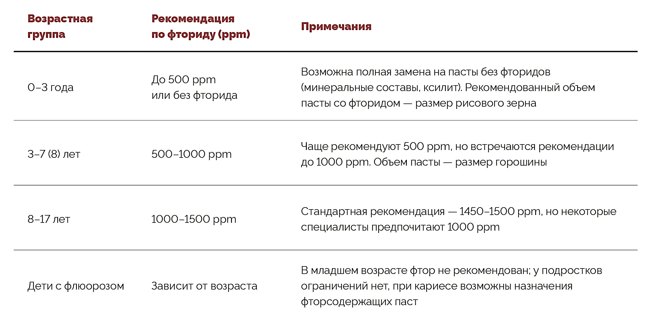 РЕКОМЕНДОВАННОЕ СОДЕРЖАНИЕ ФТОРИДА (PPM) В ДЕТСКИХ ЗУБНЫХ ПАСТАХ