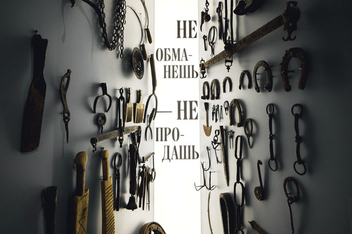 — Извозчики, трактиры, рынки и вы­вески! Увы, это исчезнувшая натура. Москву и сейчас нельзя назвать тихим городом, но во времена Гиляровского в городе грохотали экипажи, телеги, цокали копытами лошади, на разный лад кричали разносчики товаров, ругались извозчики. Фасады домов пестрели самыми разнообразными вывесками. Мне было важно предста­вить несколько подлинных вывесок в экспозиции. Молодые авангардисты Ларионов, Кончаловский, Машков, Лентулов, Моргунов, Фальк и другие создавали новое искусство не только под влиянием произведений француз­ских мастеров, с которыми они знако­мились в собрании московского купца Сергея Ивановича Щукина, вдохнов­лялись они и народным искусством.