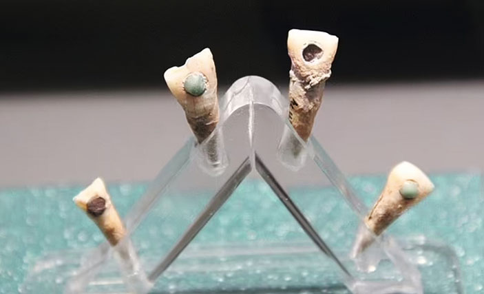 Состав герметиков, которыми крепили инкрустации, изучен. Эти прочные цементы удерживали полудрагоценный камень в зубе всю жизнь человека и века спустя после его смерти. В их составе идентифицировано 150 молекул с лечебным назначением: смола сосны с антибактериальным эффектом, эфирные масла семейства мятных с противовоспалительными свойствами. Они не давали развиваться кариесу и убивали инфекции. Чтобы установить камень, зуб приходилось сверлить, но эта работа делалась так тонко, что не затрагивала нервов и кровеносных сосудов в зубах.