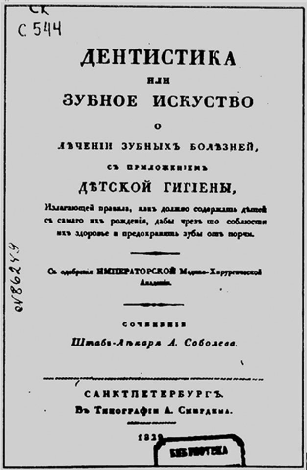 Первая российская книга по стоматологии, написанная штаб-лекарем Алексеем Соболевым, состояла из двух частей: «Дентистика» и «Детская гигиена». На ее страницах были впервые описаны принципы профилактической стоматологии: «Небесполезно было бы, если всякий имел строгое внимание к самому себе; обращал бы беспристрастное суждение на свое рождение, воспитание и здоровье родителей; ибо наследственные и современные болезни и болезненные расположения требуют благовременного истребления оных»