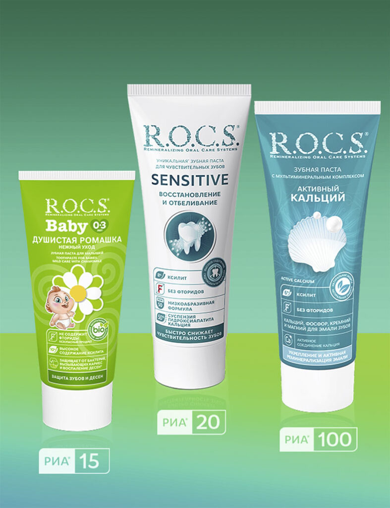 Все продукты бренда прошли проверку по системе РИА и подтвердили безопасность и точность своих абразивных характеристик. Благодаря этому стоматологи могут уверенно назначать пасты под конкретные клинические задачи — при чувствительности, наличии имплантов, смешанной ситуации, уходе за детскими зубами. Высокая степень контроля и прогнозируемости абразивности открывает возможности для создания действительно узкоспециализированных формул, включая продукты, одновременно решающие эстетические и терапевтические задачи. Только у R.O.C.S.® представлена отбеливающая зубная паста для чувствительных зубов с индексом РИА 20, эффективность которой подтверждена клиническими данными.